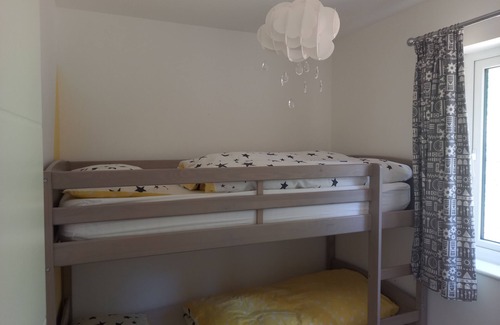 The spacious cabin has 3 bedrooms: a master with king sized bed and French doors opening onto the decking, a second bedroom with another king and a small children's room with bunk beds. This room is only suitable for children. There is a beautifully bijou bathroom with large shower and environmentally friendly toiletries.