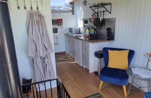 Enjoy the comforts of home whilst embracing the outdoors. Within Big Blue you will be sleeping under the stars, a huge clear dome over the bed gives you an unhindered view of the sky. The bed is in the luton so is above the main living area of the lorry, accessed by a narrrow ladder. We don't have a blind for the dome. Big Blue has electricity, so you can pop the kettle on and enjoy a meal in the mini kitchen or embrace the outdoors with the fire pit and BBQ.