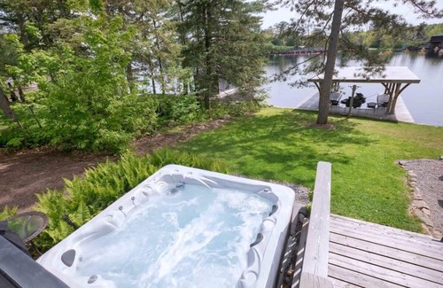 Birchwood is situated on much sought after Lake Muskoka and just minutes to the village of Bala. With a southwest lakefront exposure, there is sun all day on the dock plus take in the stunning sunsets in the evening from the eight person hot tub! Children will enjoy the sand beach with sandy shallow entry and ample gentle sloping lawn and for swimmers water is 6 feet deep water off the dock! Bring your boat and dock in the 26' covered boat slip plus friends can visit as there is space for 2 more boats! This is truly a perfect Muskoka family cottage! There is a large chef's kitchen with ample counter space and everything you require for easy family meal preparation and cleanup. All upstairs bedrooms have ensuite washrooms complete with Egyptian cotton bath towels for a touch of luxury. The master bedroom has its own private Muskoka Room with comfortable seating for guests who would like some private quiet time. In the 1890's, this was the owner's favourite room to write in.The owners have strived to maintain the original charm of this cottage built in the 1890's by maintaining the cedar wood floors and Muskoka stone fireplace while modernizing with amenities such as Air Conditioning, municipal water and high quality linens and mattresses plus on demand hot water means you will not run out of hot water even with 8 people showering!