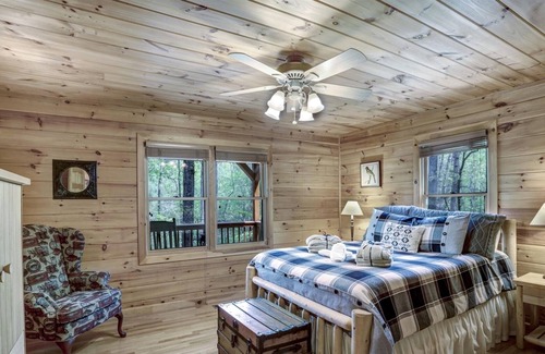 Mountain Cabin Comfort. Walk in the front entrance and feel the WOW of this luxurious lakeside cabin. Hardwood floors chase beautiful heart pine, wall to ceiling paneling. The cabin decor feels cozy.Kitchen & Dining. Prepare meals in the fully stocked kitchen that will please your host-going enthusiast. The kitchen and dining area windows bring natural light to the open floor plan. And, the extended L-shaped counteroffers a spacious buffet-style area that can easily serve 6 at the dining table. Lazy Lounging. Plush leather seating for 5-6 surrounds a stunning mountain riverstone, gas log fireplace. Watch nearly100 cable channels covering local, national, sports and more. Or, access your own Prime Video, Netflix, Apple TV, HBO Max or any of your favorite subscription-based entertainment.