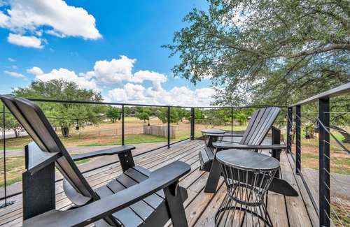 The Black Oak at Bluebonnet Trail container house rests quietly in the trees and has all the amenities of an upscale hotel room with a unique design. It hosts a cozy queen size bed, a convenient kitchenette, and an elegant full bathroom with a soothing walk-in shower. Head up to the rooftop deck to relax while stargazing or enjoying your morning coffee.
