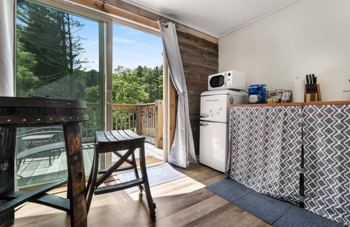 The Farmhouse has a unique layout that provides a main level living area and an upstairs suite with its own private entrance, perfect for those looking to have an in house mother-in-law suite. The main level living space includes a living room, kitchen, dining area, the Stone Room and two king bedrooms. With cozy mountain chic furniture situated around a gas log fire place and flat screen TV, the living room is a comfortable place to relax with family and friends. The Stone Room offers fun for all ages with large leather sofas, stacked stone wood burning fireplace with a mounted TV, arcade game and foosball. Two twin over twin bunk beds in the Stone Room offer an extra kids sleeping area. Upstairs at The Farmhouse boasts a second living area that can be accessed from the main level or by its own side entrance. There is are 2 king bedrooms, living area, and kitchenette with a balcony overlooking the pond. Guests at The Farmhouse will enjoy a private hot tub on the back deck. Explore the 13 plus acres of land, paddle out on the large pond or enjoy a fire in the fire pit.