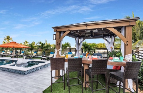 The ground floor features a peaceful and private master room with a king bed, as well as a fun and exciting kids` room with 2 twin bunk beds and an ottoman that converts into a twin bed with a topper. The living room boasts a queen-size sofa bed with a pillow-top mattress, a smart TV, and direct access to the pool and patio. With 6 full bathrooms throughout the home, convenience is key.