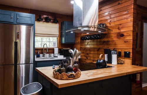 Treetop Hideaway cabin is designed with two distinct living spaces. The main level features a king bedroom with a full ensuite bathroom, a queen bunk room, another full bathroom, a living room with cozy wood-burning stove, a dining area and full kitchen. The lower level has a queen bedroom, full bathroom with walk-in shower, laundry room, game room with shuffleboard, darts, game table, TV and a gas fireplace, and another full kitchen.