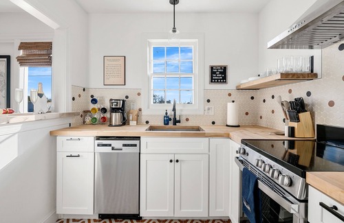 Step into our charming two-bedroom, one-bathroom home, comfortably accommodating up to four guests. Relax in the open living room adorned with boho style, catching up on your favorite shows on the large Smart TV. The fully equipped kitchen, with countertop seating for two, invites culinary adventures, and you can enjoy meals on the two porches (one screened in).