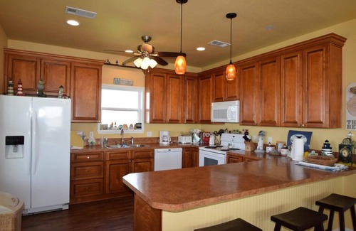 The great room offers comfortable furniture, separate dining table, and island seating. You will also love the well-stocked kitchen with all the appliances and cookware you will need (including a regular drip coffee maker). There is also a washer and dryer for your convenience!