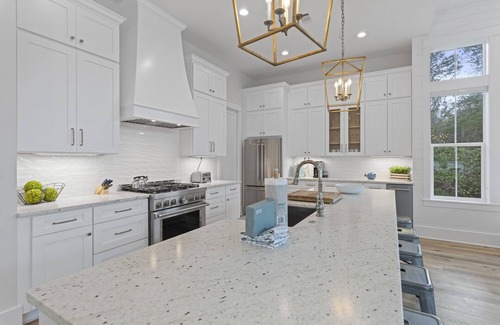 This 2-story property features an open-concept, first-floor layout with elegant beach decor throughout. A guest bedroom is off a bright and spacious corridor that leads to a luxurious great room, which is illuminated by natural light through its many windows. The gourmet kitchen—complete with KitchenAid stainless-steel appliances, including a freestanding ice maker—is perfect for any homemade family dinner. But for a quick bite, try the large kitchen island/breakfast bar with 6 stools. A comfortable living area offers plenty of seating with an oversized linen sectional and 2 matching armchairs. Watch YouTube TV for entertainment before enjoying a sit-down dinner at the 8-seat distressed wood table. From here, head outside to a covered patio or the private pool.