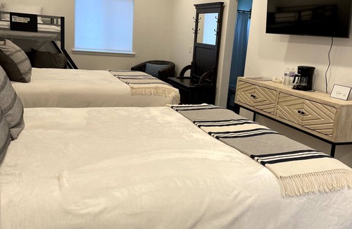 The SAGE room has 2 queen beds, 1 Full & Twin Bunk so it can sleep 7! The room is new, clean and quiet. It includes a coffee maker, extra pillows and blankets, full bathroom with a shower and bath.