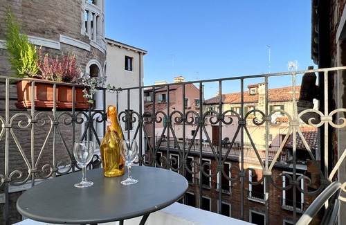 The apartment is located in the historic centre of Venice next to the wonderful "Scala del Bovolo", which can be admired from the terrace. Furnished in a typical Venetian style, it consists of a large and bright living area with a living room, kitchen and dining room. The apartment has 4 double rooms and a triple room, each room has a complete bathroom (3 with bathtub and 2 with shower). A magnificent terrace completes this majestic apartment. We are located just 300 metres from St. Mark's Square. Upon request 1 additional bed (sofa bed). Maximum capacity 12 people. Check-in time: 3:00 pm to 8:00 pm. Arrivals between 8:00 pm and 11:00 pm may require a supplement of €50 (to be paid in cash upon arrival).