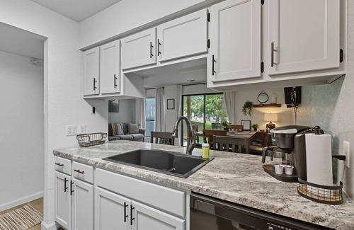 Step inside your condo and feel instantly at home. The living room is warm and inviting, with a sofa, couch, cable TV, and a cozy armchair with footrest, making it a perfect space to unwind after a day of exploring. The kitchen is fully equipped with stone countertops, modern appliances, and a Keurig drip/single-cup combo, with counter seating for two. Just beyond, the dining table for four is set for meals or game nights. Sliding doors lead to your private patio, where a table for two invites you to sip your morning coffee or evening glass of wine while taking in peaceful views of the golf course. Branson Getaway Retreat blends comfort, style, and resort living for a stay you won’t forget.