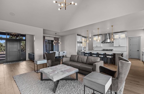This stunning Brasada Ranch home features an open layout, spacious living areas, ample natural light, and beautiful views of vast desert terrain and the Cascade Mountains.