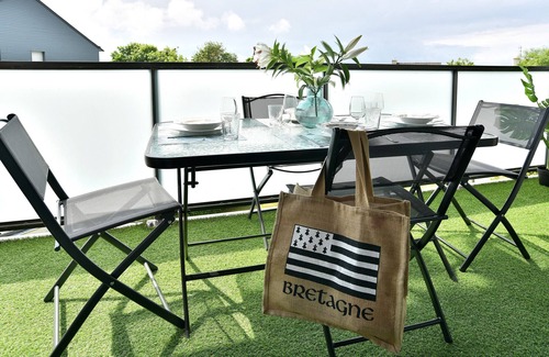 The Breizh Émeraude duplex features a balcony with outdoor furniture, perfect for al fresco meals (up to 6 guests - 4 people seated comfortably). Two deckchairs invite you to soak up the sun, read a book, or simply enjoy the gentle ambiance of the Emerald Coast.Treat yourself to a relaxing break at the Breizh Émeraude duplex, ideally located in Saint-Malo close to stunning beaches and shops, with a south-facing terrace perfect for savoring every moment of your holidays with family or friends.