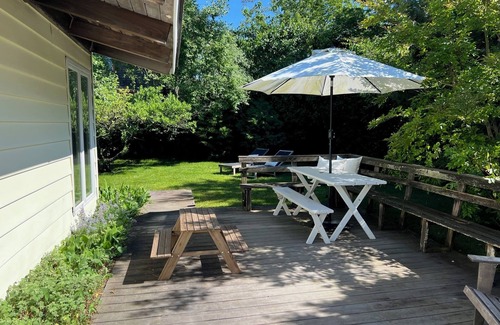 Located across from a tranquil pond and two blocks from a private sandy beach, this bright and beautiful open concept home is a magical place to spend a few days (or, ideally, weeks). Designed in the 1960s by modernist architect Andrew Geller, this just-renovated house is a well-designed combination of original mid-century accents and modern amenities. Boasting huge windows, cathedral ceilings and new hardwood floors throughout, the house has 2.5 bedrooms, 1.5 baths, a wonderful outdoor shower, a year-round fireplace, a large deck, a twinkly al fresco dining area—and a resident bunny rabbit who comes out at dusk and dawn. Guests are welcomed (encouraged, actually) to use the beach wagon, bikes and/ or electric scooters for beach trips and/ or coffee / lobster roll / BBC runs at the nearby marina spots. This is, in case you couldn't tell, an especially perfect spot for two couples or a family.