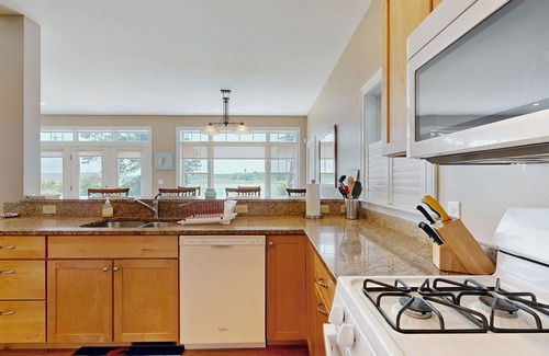 The house features a spacious patio with a firepit—perfect for unwinding in the evenings while taking in the coastal air. Inside, you’ll find a cozy gas fireplace, central AC, and a fully equipped kitchen with modern appliances, plus a dining area ideal for shared meals. There’s also a balcony overlooking the bay, an inviting spot for your morning coffee or a quiet sunset moment.