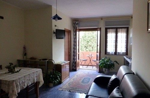 The apartment is located on the first floor and composed of entrance hall lounge with dining area and living room,1 america kitchen, n°1 bedroom with double bed, n°1 small bedroom with bunk beds, n°1 bathroom with shower, washing machine. The apartment has an air conditioning, is endowed of Wi-Fi, is fully furnished and equipped ( including towels and bed linen ) and there is a private parking and a portion of garden in common.