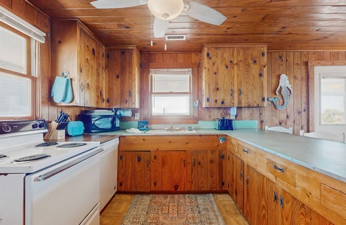 Beachy Keen is a cozy, rustic beach cottage located just up from the water, perfect for couples or small families. You'll have single-story convenience with two bedrooms and one-and-a-half bathrooms to accommodate all your guests. Relax and take in the ocean view out on the covered oceanfront deck with plenty of seating and rocking chairs, plus a private walkway to the beach. Amenities include a washer/dryer, a Keurig coffee maker, a dishwasher, a microwave, central heat and air, free WiFi, ceiling fans, a flatscreen TV, cable, hardwood floors, an outside hot and cold shower, built-in seating, and a Ping-Pong table.