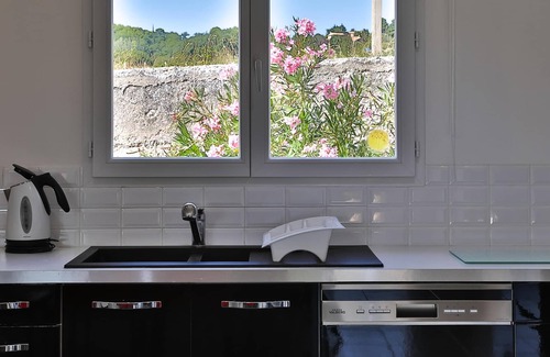 A dead-end road takes you to the end of the path and through an electric gate to your holiday home. The holiday fun can begin. The house is built entirely on the ground floor and has modern and fresh furnishings. From the bright and spacious living room and kitchen you look out onto the terrace and swimming pool. To the left of the living room are the 3 spacious bedrooms and a large, modern bathroom with a walk-in shower. Don't want to go to the supermarket every day? Next to the kitchen is a garage, where you can store your supply of water and wine. Just as easy.