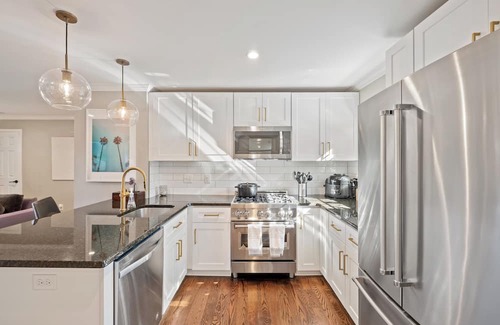 The chef’s kitchen is fully equipped and ready for your stay — featuring stainless appliances, a gas range, granite counters, and a breakfast bar for morning coffee or evening wine from the wine fridge.