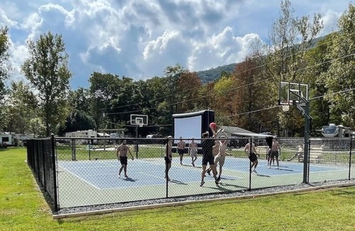Our property sits along 1600 ft of the North Toe River (stocked with Trout) and is 10 miles off the Blue Ridge Parkway in Western North Carolina. Tiny Home Cabin #5 can comfortably sleep up to 8 people and features a queen bed on the main floor and has 2 sleeping lofts, each one with a queen memory gel foam bed. The cabin also has a futon in the living room. The cabin has a cozy living room with a TV and has a full kitchen with a refrigerator, gas range, microwave, and coffee maker. The cabin has several windows that look directly out to our fishing pond and allow great mountain breezes (aided by a ceiling fan) as well as panoramic Mountain views. The cabin also has an AC for the warmer summer days as well as a propane furnace that keeps the cabin plenty warm during the Fall or Winter nights. The cabin has a covered porch that looks directly at our pond and Buck Hill Mountain. Enjoy s'mores by your fire pit any time of the year! Or grill out using our communal park style charcoal grills by our pond. You bring your own pillows, linens/blankets, and towels for the bathroom, your fishing poles, and your hiking shoes (the campground is 144 acres and we have a hiking trail to the top of Buck Hill Mountain, approximately a 60 minute hike for most people) The campground also has a laundry facility, arcade room (recently renovated with billiards, 4 pinball machines, air hockey, and arcade games) and a dedicated fiber service that provides free high speed internet all over the campground! We also added a basketball court and pickleball courts for our guests to enjoy! Snow lovers we are only 12 miles from tubing at Jonas Ridge and 22 miles from Skiing at Sugar Mountain!