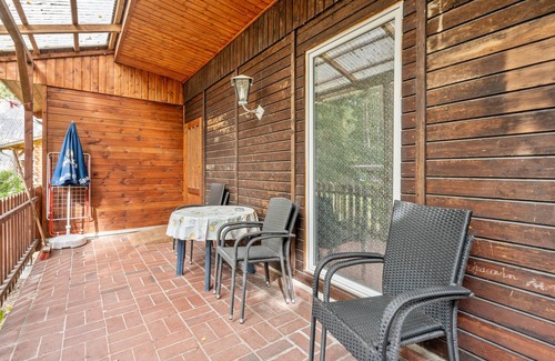 Enjoy your private, covered terrace—ideal for relaxing with your pets in the securely fenced area. The shared garden offers extra space with a barbecue and playground for families. Tall trees surround the bungalow, creating a pleasant climate in this quiet, green setting. A shared table tennis area provides entertainment during your stay.