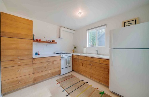 The cabin is rustic yet stylish, and although we work hard to maintain the authenticity of its original structure, the inside of the cabin has a modern, trendy style. Cabin 7 has a gas fireplace and a porch, where you can take your morning coffee while listening to the birds and soaking in the serenity of the nature around you. The cabin is set behind the highway, but close to good restaurants, grocery stores, and shopping. Lake Gregory and Lake Arrowhead are ten minutes away. We're close to Strawberry Peak, which has magnificent views, close to Santa's Workshop, hiking, paragliding, and 40 minutes to Big Bear.