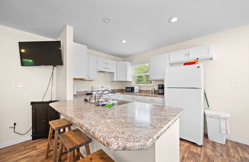 This charming house, tucked away from the hustle and bustle of city life, provides an oasis of privacy. Two bedrooms, one with a king and the other with a queen and a full-over-full bunk bed, comfortably accommodate additional guests. Its open-concept living area invites relaxation and quiet moments
