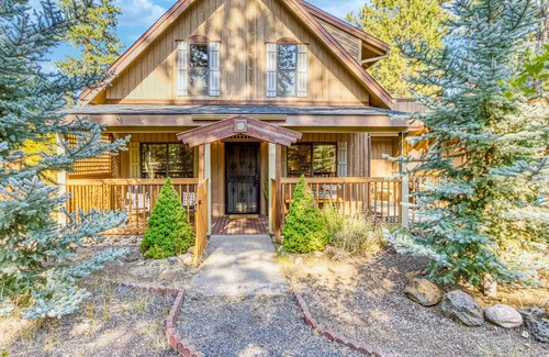Tucked in a quiet neighborhood that is minutes from the center of town, this cozy cabin, less than four miles from Fir Street Park, offers a convenient yet secluded escape to nature. Spend your days swimming in Suttle Lake or mountain biking nearby trails, then return home to unwind in one of the cabin's outdoor spaces. Rocking chairs on the front porch invite you to kick back with a cup of coffee or a good book. One patio features a gas grill for at-home barbecues, while an additional patio space boasts an outdoor dining table where you can share meals. The upstairs deck offers another spot to swap stories and sip cocktails amid tranquil tree-lined views. You'll also enjoy access to a seasonal pool where you can stretch out on loungers and soak in the sun's rays.