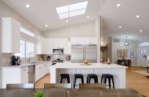 - Fully equipped kitchen with stainless steel appliances, a sleek island featuring a breakfast bar for casual seating for four, and a large dining table that comfortably seats eight for memorable meals