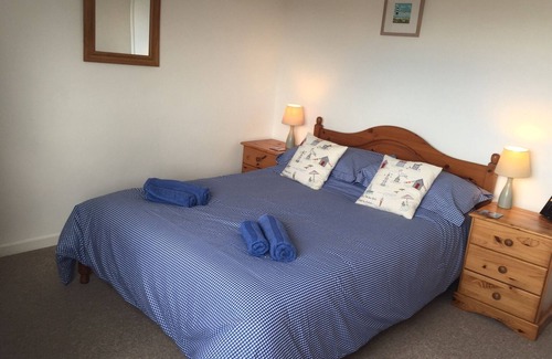 Bedroom 1 : double bed, bedside cabinets and large wardrobe overlooking the front garden and with views of the sea in the distance.