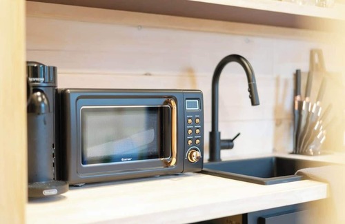 You'll find a comfortable bed with a plush king-sized bed, offering a peaceful night's sleep. The fully equipped kitchenette allows you to prepare delicious meals. It includes a induction stovetop, mini refrigerator/freezer, microwave, and all the cookware and utensils you need.