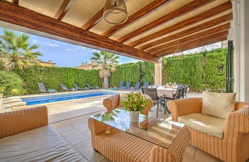Reservations are not accepted for groups of young people under 30 years of age. Can Caldero is waiting for you for a charming holiday in a quiet place like this, only a few kilometres away from the centre of Palma City. 4 bedrooms and 3 bathrooms. The exterior of "Can Caldero" will surprise you, it has a large porch equipped with high quality outdoor furniture, here you can uncork a bottle of wine and dine on fresh local produce while contemplating the pool illuminated at night, if you want to drink a Can Coleto wine you can do it here. The large terrace that surrounds the 5 x 3-metre-wide pool invites you to sunbathe on the perfectly placed sun loungers, dry off as soon as you get out of the pool, read a good book and have a refreshing drink while you relax on this magnificent holiday that you so richly deserve. The interior of the villa follows the same good taste as the exterior, from the terrace you can access the kitchen through a light sliding door, you will appreciate the high quality atmosphere of the furniture, the kitchen is fully equipped with dishwasher, microwave, coffee maker, toaster, kettle, oven and many other extras.The living room is located next to the kitchen, where a large chocolate coloured sofa with the big internet TV will make your naps even more pleasant. By the way, the internet has plenty of megabytes, so no one can complain!Climbing the stairs, you can access the bedrooms located in the upper part of the house, three of them with double beds and one with two single beds. Two of the bedrooms have en suite bathrooms. The bathrooms are fully equipped and complete.The whole house has air conditioning with hot and cold pump.Supermarket less than 200 metres away. The house is only 500m from the sea, but it is a cliff area. The Arenal beach is about 7 km away.The centre of Palma, where you can go shopping, eat, stroll or visit the cathedral of La Seu, the Bellver Castle or the Marivent Palace, is about 22 km away.The house belongs to Llucmajor, situated 17 Km away, a charming and traditional village in the south of Mallorca. You will find shops, supermarkets, cafés and restaurants where you can taste the authentic Majorcan cuisine. To the southeast, you will find the charming beach of Cala Pi, with crystal clear turquoise waters and surrounded by spectacular cliffs. Further south you will find the beaches of Ses Covetes and Es Trenc. A car is necessary to get around.- Tourist tax not included.From May to October, it costs 2.2 Euro per person, from 16 years old and over, per night.From November to April, it costs 0.55 Euro per person, from 16 years old and over, per night.
