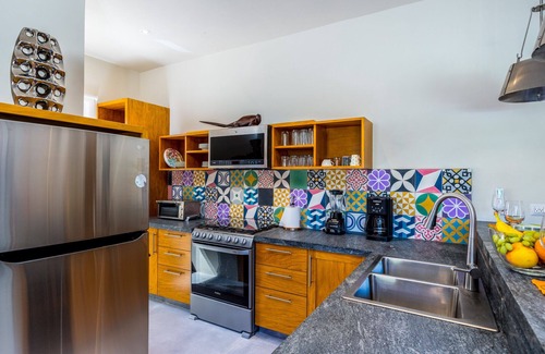 Upon entering Casa Dorothy this fully furnished open-floor plan apartment with 10-foot ceilings, is a blend of modern and Mexican hacienda style finishes. The open area offers a comfortable sitting area with a beautifully designed kitchen offers all the basics (and more) for a short or long stay. Brand new appliances include a refrigerator, a gas cooktop with oven, microwave, blender, pots and pans to cook, dishes, glassware and even a coffee maker. Additionally, wireless internet and two air conditioning units and a office area. Off the living area is a fully appointed bathroom with shower.