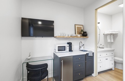 This 190 sqft queen-bed unit has a flat-screen smart TV with streaming, casting, or Airplay features and a Samsung split heating/AC system for ultimate comfort. A private en-suite bath with a rain shower and a kitchenette with Nespresso, microwave & mini fridge complete this stay in Santa Barbara.