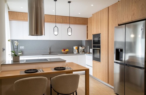 On the first floor, there is a maisonette, extending over 2 levels, featuring 3 bedrooms. On the ground floor, the main living area is found with comfortable seating for everyone, a bathroom, a kitchen, located on the ground floor, is fully equipped featuring an impressive long dining area, perfect for family dinners. TV, and a modern fireplace, making it the most relaxing area. On the first floor, there is the master bedroom, a spacious bedroom with two single beds and one more semi-double bedroom. All bedrooms have air-conditioned and share the bathroom on this floor.