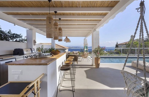 First, sitting under a voluminous cane-topped pergola, is a convivial dining area, a superbly equipped outdoor kitchen with a pair of electric barbecues and a fridge, a bar, and a comfortably furnished sitting area.