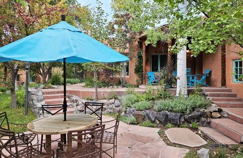 Celia - A beautiful, historic adobe home set in a lovely garden perfect for a secluded Taos getaway. The home exudes New Mexico charm with its thick adobe walls, beamed viga ceilings and a kiva fireplace. Newly installed Mini Split AC units in each bedroom which cool the rest of the home when doors left open. A fully stocked kitchen with a charming dining room and outdoor dining area make entertaining easy any time of year. Two very separate master bedroom suites (one king; one queen) make this home an ideal choice for two couples. Each suite has 2 beautifully remodeled bathrooms featuring New Mexican travertine and sandstone. Completely updated, the home is beautifully furnished and very comfortable. The park-like setting provides a quiet oasis with lovely gardens; a beautifully terraced yard and patio with old growth aspens and fruit trees, and a secluded hot tub (upcoming in September 2020) making this the perfect setting to unwind after touring galleries, or enjoying a vigorous day of hiking or skiing. An easy 10 minute walk to the central downtown Taos Plaza or to El Monte Sagrado, this home is located in a great residential neighborhood, on a quiet lane just off Kit Carson Road making it one of the most popular Taos vacation rentals in Premiere Properties’ offerings.