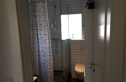 Main bedroom has a 160x200 cm bed and spare bedroom has a sofa bed 145x200 cm. Common bathroom inside apartment. Kitchen has everything needed for cooking. Washer and dryer located in basement.