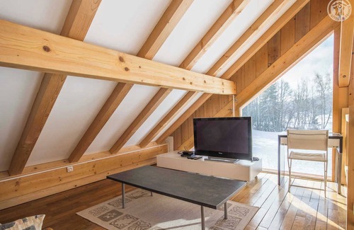 Duplex gîte on the 1st floor of a chalet also including another gîte. Independent entrance via exterior staircase. Large living room facing south, not overlooked (living room, lounge, kitchen). 1 bedroom (1 double bed 140x190cm and a baby bed and changing table) with private bathroom (shower and WC). 1 bedroom (2 single beds + 1 single bed on a mezzanine 90X190 cm). Bathroom and separate WC with hand basin. Upstairs: mezzanine open to living room with lounge and TV. Sleeps 6 (1 double bed 140x190cm and 4 single beds). 1 bedroom (1 double bed 140x190cm). 1 bathroom and separate WC with hand basin. South facing terrace. Private parking on the property. Duplex in contemporary chalet located on the edge of the La Féclaz resort, in the middle of the Nordic village. Immediate quality environment without vis-à-vis. Pleasant and well exposed private terrace. Shops and services in the heart of the resort in season.