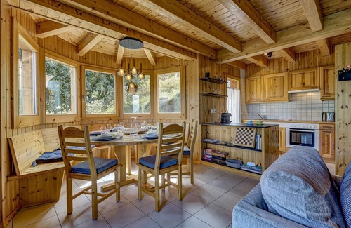 Bedrooms & BathroomsThis three-bedroom chalet comfortably sleeps up to 6 people in two large double bedrooms and a bunk bedroom. All of the bedrooms have high, sloping ceilings with exposed beams. There are two bathrooms: one (near the downstairs sauna) with shower and the other (upstairs near the bedrooms) with large corner bath fitted with hand shower.