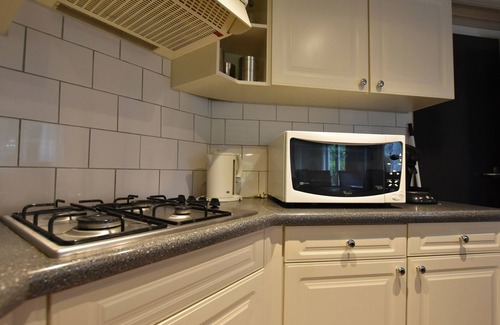 Layout: Ground floor: (open kitchen(electric kettle, cooker(4 ring stoves, gas), coffee machine(pads), combination microwave, dishwasher, fridge-freezer), Living/diningroom(TV, dining table, seating area), bedroom(2x single bed), bedroom(3-person bunk bed), bathroom(shower, washbasin, toilet))