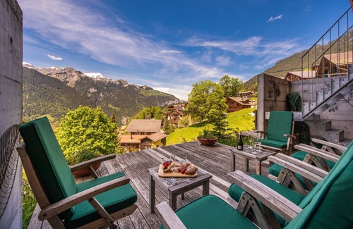 This apartment has a very homely, comfortable ambience - the perfect choice for a family or a group of friends. It is airy and bright with floor-to-ceiling windows giving dazzling views of the Lauterbrunnen Valley and surrounding mountains. There is access to the wooden west-facing garden terrace from both the living room on the 1st floor and bedrooms on the ground floor. Here you can soak up the sunshine and views while enjoying a well-earned glass of wine and a plate of fine Swiss cheese after your day of hiking or skiing!