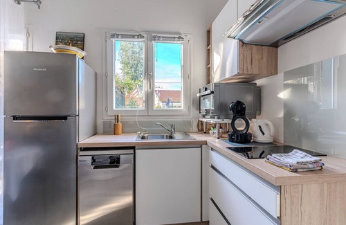 Located in La Teste-de-Buch, the chalet "Studio Bassin D'Arcachon" has everything you need for a comfortable stay. The 30 m² property consists of a living room with a sofa bed for 2 people, a fully-equipped kitchen, 1 mezzanine, and 1 bathroom, and can accommodate 4 people. On-site amenities include high-speed Wi-Fi (suitable for video calls), a TV, air conditioning, a dishwasher, a capsule coffee machine, and a fan. A baby cot is also available.