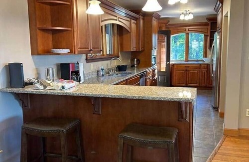 The Charlemont Chalet is designed for those who crave serenity, mountain air, and a touch of rustic luxury. Here's a quick summary of what makes this place so special. Secluded on 15 private acres, halfway up a mountain in Charlemont but close to nature and fun activities. The chalet is spacious, stylish and designed for your comfort. Less than 2 miles to Zoar's Outdoor and close to Berkshire East, Shelburn Falls, North Adams (Mass Moca) west on the Mohawk Trail or Greenfield on the east. This Charlemont Chalet is perfectly sited on 15 acres offering complete privacy with stunning mountain views. The open kitchen is the heart of the retreat and has all top of the line stainless steel appliances. You will enjoy using the oven, the microwave, the oversized refrigerator, the luxurious cherry cabinets and oh so much space to create your culinary experience. The bar seating invites conversations, convenience while having a quick bite. For those whose work always follows, there's a dedicated office area tucked away on the main floor so while you work you can enjoy the view and check out the festivities on the deck or at the firepit. There are 2 ensuite bedrooms on the second floor. The master is spacious and has a sitting area, and a large walk in closet that spans the entire width of the chalet. There's a third bedroom on the main level with a full size bed and a 1/2 bath and a washer/dryer just off the living room for your convenience. The chalet is the ultimate vacation getaway for those who love the mountains and country living. Enjoy time on the expansive deck, or sitting around the firepit making a campfire and s’mores. Harvest farm fresh organic vegetables and herbs grown out of our own 3 season green house. We have tomatoes, cucumbers and squash in the summer and fresh herbs all year round! Walk in the woods or down to the charming/rustic chic Shed! Charlemont is Western Massachusetts mecca for outdoor adventurers; Summer fun includes fly fishing, kayaking, white water rafting, and tubing down the Deerfield River. Mountain biking, zip lining, and coaster rides at Berkshire East. Hiking the many trails, including Mt Greylock. Enjoy a visit to Mass Moca just 30 min away, or the Clark Art in Williamstown. Whatever you do make sure you visit Mo’s Fudge Factory and the Bridge of Flowers in the charming Shelburn Falls! In the winter months enjoy skiing and snow tubing at Berkshire East, cross country skiing, and snow shoeing the many area hiking trails. Guest access You will be given a code that unlocks the main entry door under the deck in the lower level by noon on check in day. You will have access to the entire house and the property including the 3 season green house. If there is anything in the fridge or pantry you want to use you may help yourself. If you’re using the last of anything, kindly let the host know or replace it. Other things to note The Charlemont Chalet is located halfway up the Hawk's mountain in rural massachustts. In the winter (esp when it snows) you need an SUV with AWD (All Wheel Drive) or 4-wheel drive car to get to us. The Chalet sits up a windy (beautiful) driveway. If you find yourself driving a car with summer tires and can’t make it up the hill please park near the rustic shed halfway up the driveway and walk up. Wayne will plow multiple times during a snowstorm so you will be able to get in/ out. We also have shovels and sand (in buckets) by the entrance door (under the deck) and near the shed. There’s enough parking for 3 cars in the driveway and additional cars at the Chic Shed. If you need storage for your canoes, snow mobiles or other sporting equipment please let us know. We will provide the key to the shed for your use. Dogs are warmly welcomed (Please be sure to let us know and pay the pet charge so we can inform the cleaner in advance). We will also provide a dog kennel and dog bowls for your 4 legged pal. Guest access You will be able to access the entire chalet (indoor and out) Guests have total privacy and are invited to enjoy the produce from the green house. Currently there are plenty of tomatoes, squash, cucumbers and lots of arugula. We live nearby although we wish to give guests total privacy. We’re available to answer questions via phone or text.