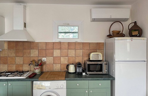 Welcome to this charming apartment in Velleron with a large private garden, parking, a shared pool, and a petanque court. La Fontaine is located in Velleron, France on our private secluded 1-acre countryside villa, surrounded by forests. We are a 5-minute drive from our local village of Velleron or a 20-minute walk and a 10-minute drive from L’Isle sur la Sorgue an extraordinary picturesque small town. Ther are hiking trails and bike trails just a few yards from our driveway. This peaceful retreat features 2 cozy bedrooms - one with a queen bed and the other with two twin beds. The bathroom is equipped with a shower and a hair dryer for your convenience. With amenities like AC, WiFi, and a washing machine, guests can relax and unwind in this beautiful space. The apartment is on the same property as our primary home that we share with our cat and dog.
