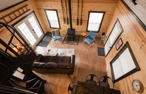 This 1930s home was part of a small resort in the first half of the 20th century. It has been completely remodeled with wood panelling throughout the space and a number of modernist touches.