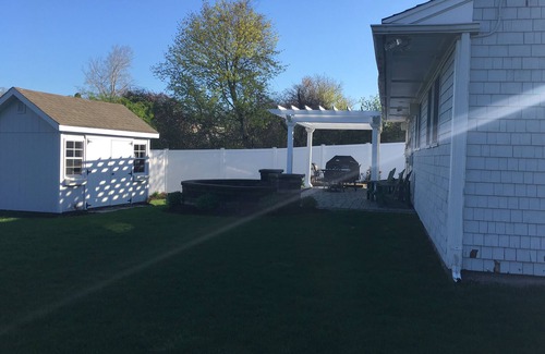 Outside you will enjoy a spacious paver patio with a shaded Pergola and dining area, a Fire Pit for evening campfires and s’mores, Adirondack chairs for relaxing, a new Weber gas grill, AND outdoor shower. The lush lawn is spacious and private, enclosed by a privacy hedge along the driveway, tree-line in the back, and fence on the other side. In the storage shed you will find plently of beach chairs and a beach umbrella for your use, five adult bicycles (bring your own helmets), a paddleboard, and corn hole game boards.