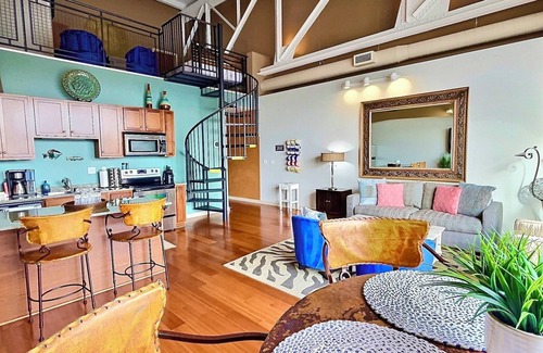 In the two-level condo there is a spiral staircase that takes you to the loft area. The second bedroom is located in the loft area of the condo and it is a shared space. There is a queen bed and two twin beds in the loft area. There is a full size bathroom with a shower in the loft area. There is a Pac Man video game in the loft and board games to enjoy. There are 3 TV's with streaming device located throughout the condo in the living room, master bedroom, and in the loft area.