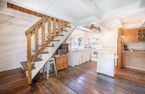 The main floor is an open kitchen/ living room with an island eating station. Or you can pull out the TV tray next to the loveseat to properly veg out while streaming movies. The surprising large is just off the living room. If you want an outdoor experience, sit on the back deck and watch the fireflies in the summer nights.