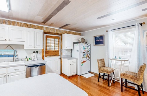 Back at the cottage, you'll be glad to know there are plenty of lovely amenities for you to enjoy, such as the private enclosed yard, the full kitchen with stainless steel appliances for you to cook up a meal for you and your guests, a washer/dryer, and an outdoor shower. Walk in through the front door and take in the seaside aesthetic in the living area, complete with a comfortable blue couch to take a quick power nap on. This quaint cottage is adorned with charming knick-knacks and its own humble golf course right in the backyard. Sail away to this breathtaking home!