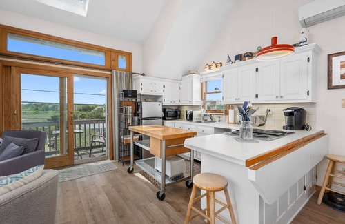 The cottage features a unique reverse layout, with comfortable bedrooms located on the first floor, offering a peaceful retreat after a day of sun and sand. Upstairs, the bright and cozy living space opens up to a private balcony with serene views of the surrounding marshland, perfect for morning coffee or sunset cocktails. Just off the kitchen, peek-a-boo ocean views add to the coastal ambiance while you cook or dine.